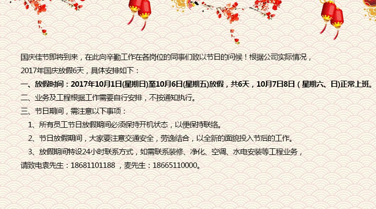 3、放假期間特設(shè)24小時(shí)聯(lián)系方式,如需聯(lián)系裝修、凈化、空調(diào)、水電安裝等工程業(yè)務(wù), 請(qǐng)致電袁先生:18681101188 ,麥先生:18665110000。
